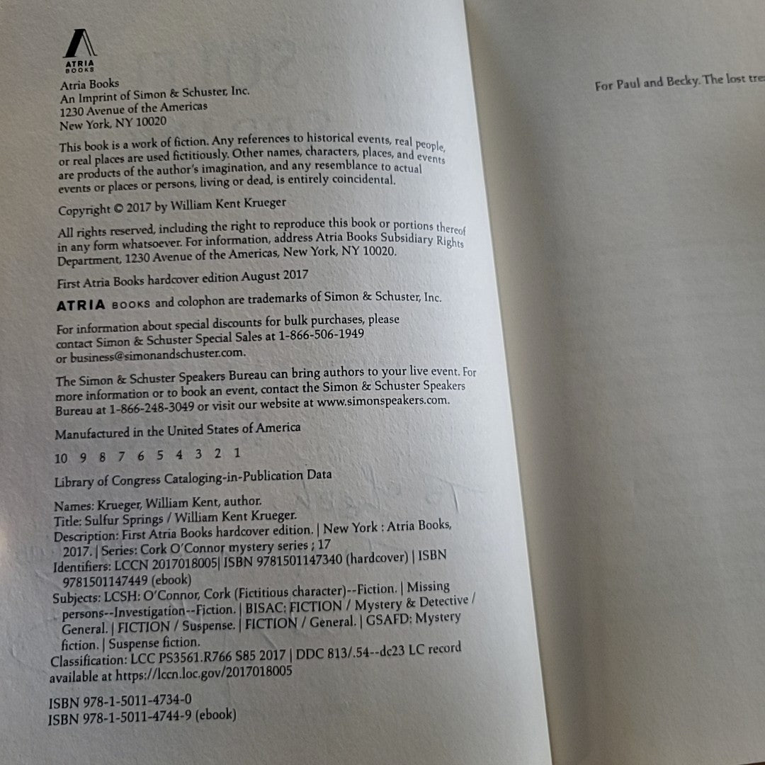 William Kent Krueger's Novel Sulfur Springs Hard Cover and Inscribed by Author in New Like Condition. Can set appt to view at Odds and Ends Again in Arden Hills, MN or can be shipped. Thank You